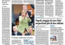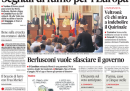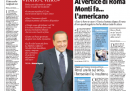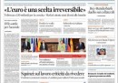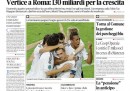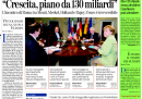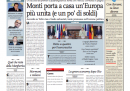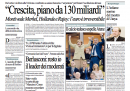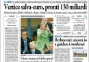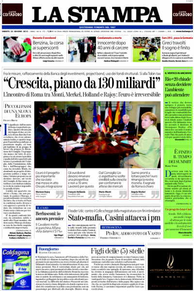 Quasi tutti i quotidiani di oggi aprono con il vertice di Roma fra Monti, Merkel, Hollande e Rajoy e l’intesa su un piano per la crescita da 130 miliardi di euro, ma i giudizi sui risultati dell’incontro sono differenti: “risultato a metà” per il Messaggero, “piccoli passi” per l’Unità, “successo” per Europa, “delusione” per il Secolo d’Italia, “primo passo” per il Corriere della Sera. Il Giornale e il Secolo d’Italia titolano invece sull’annuncio di Berlusconi, che si candida alla guida di un nuovo partito per il dopo PDL.