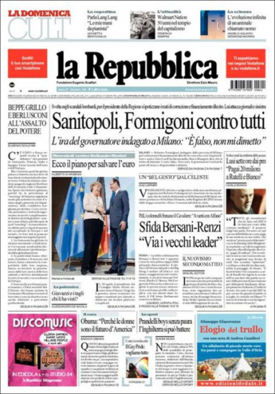 Oggi i principali quotidiani italiani hanno aperture molto varie. La Repubblica sceglie il caso del governatore della Lombardia Roberto Formigoni indagato dalla Procura di Milano, il Corriere della Sera parla di “spettro del voto a ottobre”, mentre il Sole 24 Ore si concentra sull'”Unione Bancaria nel piano UE-BCE”. Libero e il Tempo, invece, sottolineano la spaccatura che c’è nel PDL sull’eventuale ricandidatura di Silvio Berlusconi alle prossime elezioni politiche. E poi oggi c’è la partita: Italia-Inghilterra, l’ultimo quarto di finale degli Europei 2012. Chi vince incontra la Germania.