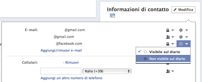 Per inserire nuovamente il proprio vecchio indirizzo di posta elettronica personale, nel caso in cui sia stato sostituito automaticamente nel Diario, bisogna andare nella sezione “Informazioni”, cliccando sul link nella pagina principale del proprio profilo. Nella pagina che compare è sufficiente cercare l’area “Informazioni di contatto” e fare clic su “Modifica”. Si apre una scheda dove compaiono gli indirizzi email collegati al proprio profilo e da lì si può scegliere di rendere nuovamente visibile la propria classica email e di nascondere (se lo si desidera) quella @facebook.com. Infine basta cliccare su “Salva” alla fine della scheda e la sostituzione è fatta.