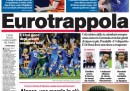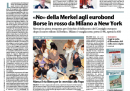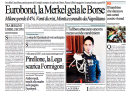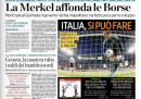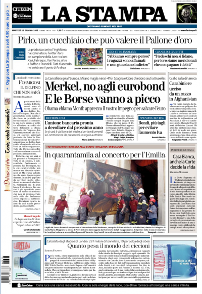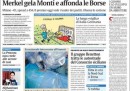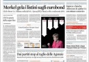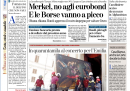 Il no del cancelliere tedesco Angela Merkel agli eurobond e a qualunque iniziativa di condivisione del debito a pochi giorni dal vertice europeo di Bruxelles e la conseguente giornata nera per le borse europee sono la notizia di apertura per tutti i giornali di oggi. Fanno scelte diverse il Manifesto, che si occupa della decisione del governo di porre la fiducia per l’approvazione della riforma del lavoro, e il Secolo d’Italia, che apre sulla proposta di Casini di un’alleanza elettorale con il Partito Democratico, mentre i quotidiani sportivi sono già in fibrillazione per la semifinale degli europei di giovedì contro la Germania.