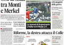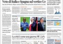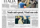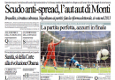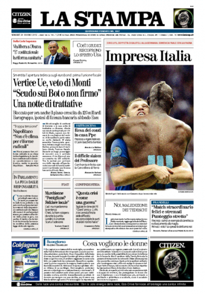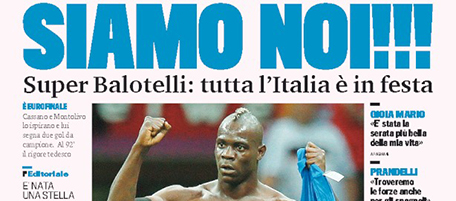 La vittoria dell’Italia sulla Germania nella semifinale degli europei grazie a due gol di Balotelli è la notizia di apertura per quasi tutti i giornali di oggi. Repubblica, il Sole 24 Ore, l’Avvenire e l’Unità si occupano invece del vertice europeo e delle iniziative anti-spread richieste da Monti, mentre il Manifesto titola sulle parole di Marchionne su Pomigliano dalla Cina, dove ha inaugurato un nuovo stabilimento.
