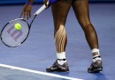 Quei cerottoni blu sono strisce elastiche che si usano in un metodo fisioterapico di nome kinesio taping