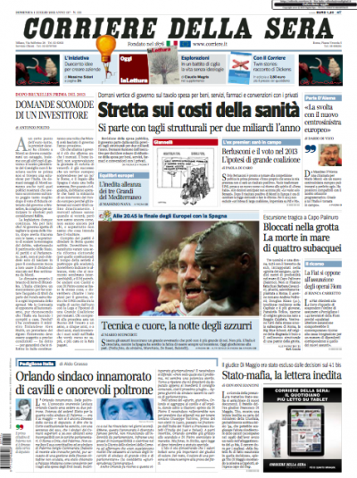 I tagli in vista alla spesa pubblica da parte del governo, che da domani dovrà rivedere le spese per mettere in pratica gli accordi presi al vertice europeo, sono la notizia che si contende le aperture dei quotidiani di oggi con l’attesissima finale di questa sera, a Kiev, dove la nazionale italiana di calcio giocherà contro la Spagna per il titolo europeo. Molti quotidiani danno spazio in prima pagina anche all’incidente mortale che ieri ha coinvolto 4 sub a Palinuro, in provincia di Salerno.