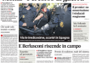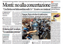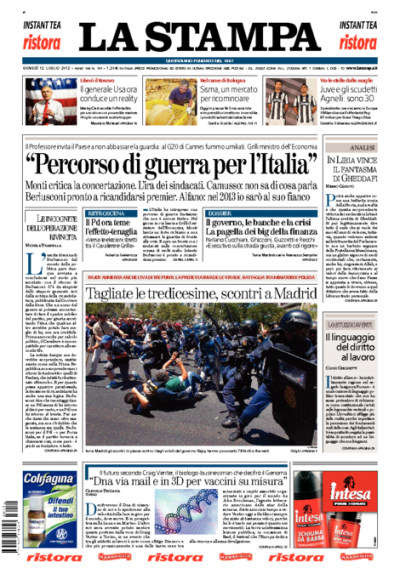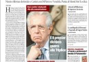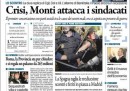 La maggior parte dei giornali di oggi dedica l’apertura all’intervento all’assemblea delle banche del Presidente del Consiglio Monti, che ha indicato la concertazione come origine dei problemi che deve affrontare il governo e richiamato tutti a non abbassare la guardia sul “percorso di guerra” intrapreso per raddrizzare i conti del paese. Il Giornale, Libero, il Secolo d’Italia, Europa, il Fatto e il Tempo si occupano invece del ritorno in campo di Silvio Berlusconi, candidato premier per il PDL alle prossime elezioni. I quotidiani sportivi titolano sulla possibile cessione di Ibrahimovic e Thiago Silva dal Milan al Paris Saint Germain.