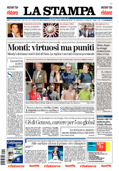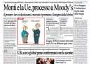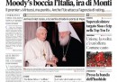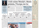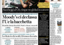 La notizia di apertura per quasi tutti i giornali di oggi è il declassamento dell’Italia da parte dell’agenzia di rating Moody’s, che ha provocato le proteste di Monti e dell’Unione Europea ma è stato ignorato dai mercati economici, chiusi in positivo ieri. Il Manifesto e il Secolo XIX titolano invece sulla conferma in Cassazione delle condanne per le violenze al G8 di Genova, mentre Libero e il Tempo seguono i movimenti nel PDL in preparazione per le prossime elezioni.