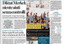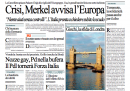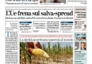 La notizia di apertura per molti giornali di oggi è l’intervista del cancelliere tedesco Merkel alla televisione tedesca nella quale ha frenato sullo scudo anti spread europeo, dichiarando di voler mantenere il controllo sugli aiuti agli altri paesi. Il Corriere della Sera titola invece sul piano del governo di vendita dei beni pubblici, mentre il Giornale presenta il programma economico del PDL e l’Unità attacca Beppe Grillo per le sue parole contro Rosy Bindi sulle unioni omosessuali, definendolo “come Berlusconi”. Per i quotidiani sportivi l’apertura è sulla ennesima polemica fra Inter e Juventus sul numero di scudetti della Juventus.