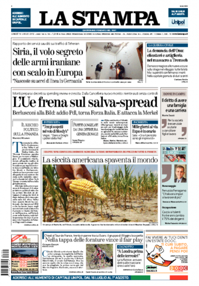 Le prime pagine di lunedì 16 luglio 2012