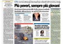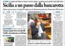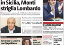 Per quasi tutti i giornali di oggi la notizia di apertura è l'”ultimatum” di Monti al governatore della Sicilia Lombardo perché confermi le sue dimissioni, per evitare il fallimento della regione (già fallita per Libero e il Giornale). Fanno eccezione l’Unità e Avvenire, che si occupano invece dei dati dell’ISTAT sulla povertà in Italia, in aumento soprattutto fra i giovani e al Sud, e Repubblica, che torna sulle vicende giudiziarie di Silvio Berlusconi, convocato a testimoniare a Palermo sui suoi rapporti con Dell’Utri per l’inchiesta sulla trattativa fra stato e mafia.