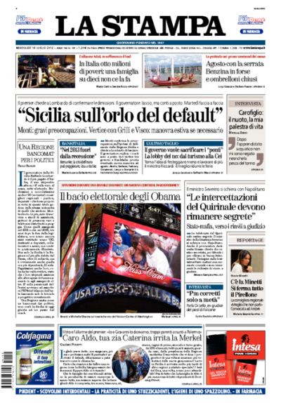 Per quasi tutti i giornali di oggi la notizia di apertura è l'”ultimatum” di Monti al governatore della Sicilia Lombardo perché confermi le sue dimissioni, per evitare il fallimento della regione (già fallita per Libero e il Giornale). Fanno eccezione l’Unità e Avvenire, che si occupano invece dei dati dell’ISTAT sulla povertà in Italia, in aumento soprattutto fra i giovani e al Sud, e Repubblica, che torna sulle vicende giudiziarie di Silvio Berlusconi, convocato a testimoniare a Palermo sui suoi rapporti con Dell’Utri per l’inchiesta sulla trattativa fra stato e mafia.