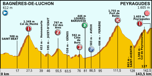 La tappa di oggi partirà da Bagnères-de-Luchon, una cittadina termale nella regione di Midi-Pirenei, a 612 metri di altitudine, e si concluderà con l’arrivo in salita di Peyragudes, a 1605 metri. È una tappa da scalatori, visto che il percorso, lungo 143 chilometri, è segnato da cinque gran premi della montagna (di cui tre di prima categoria e uno fuori categoria, di quelli che assegnano più punti perché sono i più impegnativi) e da uno sprint intermedio.