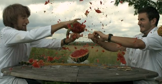 Gav e Dan (gli SlowMoGuys) hanno visto su internet un video in cui un gruppo di ragazzi faceva esplodere un’anguria avvolgendo attorno al frutto un numero sempre maggiore di elastici di gomma, e hanno deciso di riprodurre l’esperimento per riprenderlo in slow-motion.