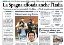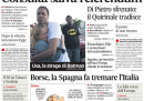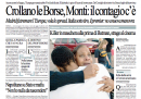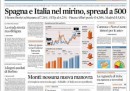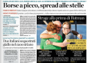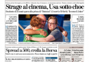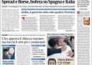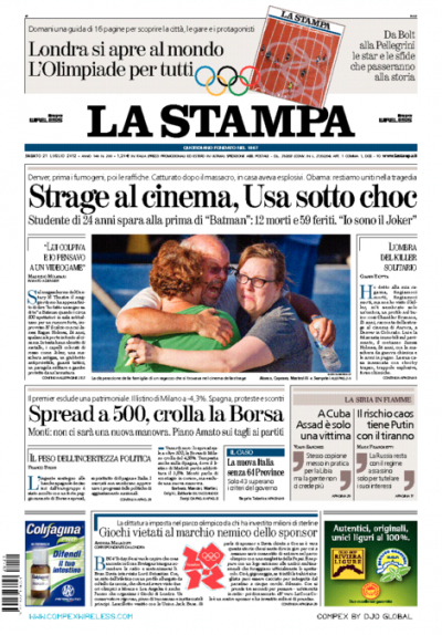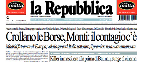 I dati dei mercati economici, con il crollo delle borse, lo spread sopra i 500 punti e il “contagio” (nelle parole di Monti) della crisi economica dalla Spagna all’Italia, sono in apertura sulla maggior parte dei giornali di oggi. Fanno eccezione la Stampa, che si occupa invece della strage in Colorado nel cinema in cui si proiettava la prima di Batman, e l’Unità, che titola sul pronunciamento della Corte Costituzionale che “salva” il risultato del referendum sull’acqua.