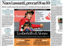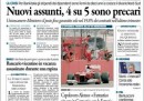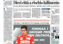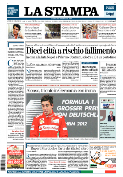 I nuovi dati sul mercato del lavoro sono in apertura su molti giornali di oggi, con le cifre di Bankitalia sugli stipendi dei lavoratori dipendenti, fermi da dieci anni, e quelle del Ministero del Lavoro, per il quale l’80% dei nuovi assunti ha un contratto precario. La Stampa titola invece sul rischio di fallimento per dieci grandi città italiane, Repubblica si occupa della minaccia di esclusione dall’Euro della Grecia da parte della Germania e del Fondo Monetario Internazionale, l’Unità ipotizza un accordo fra i partiti per andare a votare a novembre, e il Giornale polemizza con Monti, che si è definito “statista”. I quotidiani sportivi aprono tutti con la vittoria di Alonso nel gran premio di Germania.