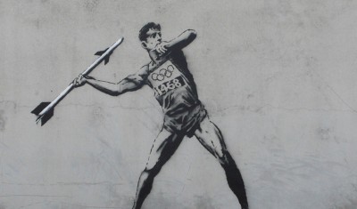 L’artista inglese noto come Banksy, diventato forse la maggior celebrità al mondo della “street art” (anche grazie alla segretezza sulla sua identità), ha pubblicato sul suo sito due nuove opere dedicate alle Olimpiadi di Londra. Nel primo disegno c’è un atleta che lancia un missile al posto del giavellotto, nel secondo un altro atleta che salta con l’asta per atterrare su un materasso vero. Non si conoscono ancora i luoghi dove sono state realizzate le opere.