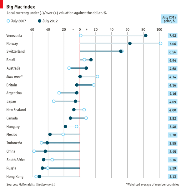 L’indice Big Mac può essere utilizzato anche per confrontare l’andamento dell’economia in un certo periodo di tempo. L’Economist ha da poco pubblicato un nuovo grafico in cui sono indicati i cambiamenti dal 2007, anno di inizio della crisi economica, a luglio del 2012. Nello schema la valuta di riferimento è il dollaro e le linee orizzontali mostrano quali valute si sono svalutate o sopravvalutate rispetto alla moneta statunitense. I pallini chiari mostrano il dato del luglio 2007, quelli scuri il dato del luglio 2012.