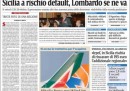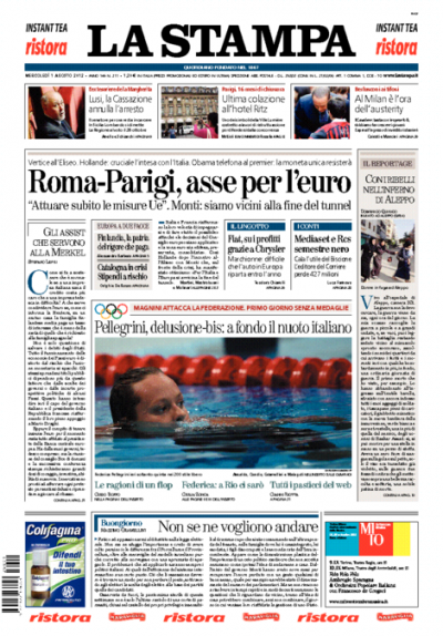 L’incontro a Parigi fra Monti e Hollande e la loro richiesta all’Europa di attuare subito le misure a difesa dell’euro è in apertura su molti giornali di oggi. Il Corriere della Sera si occupa invece del black out che ha colpito l’India, Repubblica della “campagna d’agosto” del fisco contro l’evasione, il Secolo XIX e Libero seguono le dimissioni di Lombardo e il voto di ottobre in Sicilia, il Manifesto e la Padania titolano sui dati di giugno sulla disoccupazione in Italia arrivata a un nuovo record, e l’Unità e Europa aprono con la carta d’intenti del PD presentata ieri da Bersani.