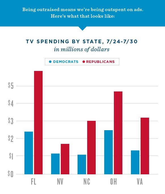 Dopo maggio e giugno, anche a luglio Mitt Romney e i repubblicani hanno raccolto più soldi di Barack Obama e dei democratici. Mancano tre mesi alle elezioni presidenziali e lo staff di Obama ha mandato questa infografica ai suoi sostenitori per illustrare loro la situazione e motivarli a fare di più.