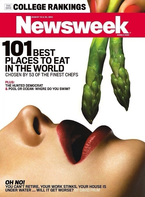 La copertina della rivista americana Newsweek di questa settimana – dedicata ai «Migliori 101 posti al mondo dove mangiare» – ha ricevuto numerose critiche. È stata definita da molti giornalisti e lettori eccessivamente allusiva dal punto di vista sessuale e molti invece ne hanno sottolineato la scarsa originalità. L’immagine infatti è una cosiddetta “immagine di stock”, cioè una foto da catalogo messa a disposizione dalle agenzie fotografiche ai propri clienti per illustrare temi e idee di carattere generale – e infatti piuttosto banale e ricorrente. Era stata già utilizzata per la copertina del britannico Observer Food Monthly nell’aprile 2008 ed era apparsa nel numero di maggio 2012 di Harper’s Bazaar.