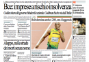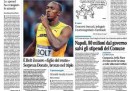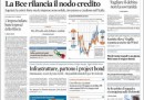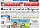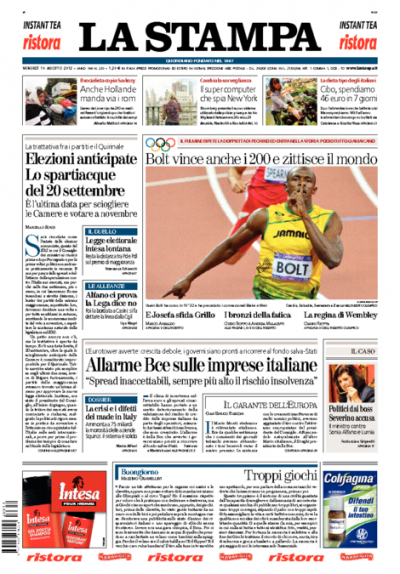 L’allarme della Banca Centrale Europea sul rischio di insolvenza per le imprese italiane e l’invito a Spagna e Italia a richiedere gli aiuti previsti dal fondo salva stati sono la notizia di apertura su molti quotidiani di oggi. La Stampa e i giornali sportivi si occupano invece della vittoria di Bolt nei 200 metri alle olimpiadi, il Manifesto segnala preoccupato il rischio di svendita dei beni del patrimonio immobiliare pubblico, e l’Unità apre con un’intervista al Presidente della Repubblica Napolitano che invita i partiti a approvare presto una nuova legge elettorale.