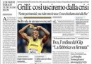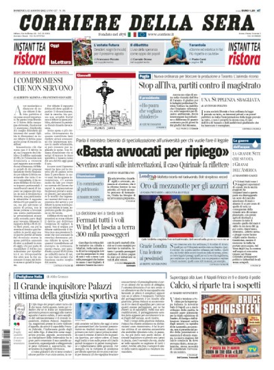 I titoli maggiori sui quotidiani sono assai diversi tra loro questa domenica, dopo un sabato senza grandi notizie: l’Ilva, un’intervista a Grilli, la “crescita”, una questione con gli avvocati, quasi niente di esteri. Ad accordare le prime pagine è soprattutto la vittoria della medaglia d’oro di Carlo Molfetta nel taekwondo, arrivata tardi ieri sera (Repubblica gli preferisce il record mondiale della staffetta di Bolt): ma c’è altro sport in arrivo, e non nel migliore dei modi, come mostrano soprattutto le indignate prime pagine del Mattino e del Corriere dello Sport.