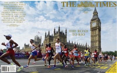 Quasi tutte le prime pagine dei giornali inglesi di oggi riportano la stessa foto: lo stadio Olimpico durante la cerimonia di chiusura dei Giochi illuminato con i colori della bandiera del Regno Unito. La prima edizione del Times – che ha realizzato le più belle prime pagine dedicate ai Giochi – presenta gli atleti impegnati a correre la Maratona con alle spalle il Parlamento britannico e il Big Ben, accompagnati dal titolo The road to Rio, La strada per Rio, a simboleggiare il passaggio di consegne tra Londra e Rio de Janeiro che ospiterà le prossime Olimpiadi nel 2016.
