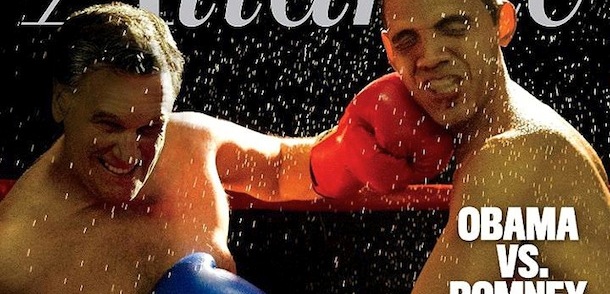 La copertina di settembre dell’Atlantic è un fotomontaggio di un incontro di boxe tra i due candidati alla presidenza degli Stati Uniti, l’attuale presidente Barack Obama e il repubblicano Mitt Romney. La copertina è stata realizzata per illustrare un pezzo di James Fallows sui dibattiti elettorali, che iniziano il 3 ottobre.