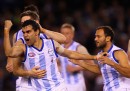 Diversa gente allegra, tra le migliori foto sportive della settimana: il pilota di NASCAR Greg Biffle festeggia un successo facendo fumare i copertoni sul prato di fianco alla pista di un autodromo nel Michigan, mentre altri, come i calciatori del’Everton Maroune Fellaini e Steven Pienaar, danzano in campo sorridenti come bambini. Il calciatore australiano Lindsay Thomas, invece, esultando per il gol appena realizzato, negli occhi ha la rabbia di chi finalmente regola qualche conto personale, mentre il fantino italiano Frankie Dettori, con le braccia sulla testa a formare un cuore – per la verità un po’ goffamente – sembra cercare con lo sguardo una donna sugli spalti, a York.