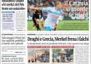 Sono due le notizie in apertura sui quotidiani di oggi: lo stop dalla Germania all’acquisto di bond dei paesi in crisi da parte della BCE, proposto da Draghi nei giorni scorsi per abbassare lo spread, e la polemica fra il segretario del PD Bersani e Beppe Grillo, dopo che il primo aveva definito “fascisti” gli attacchi di Movimento 5 Stelle e Italia dei Valori. Molto spazio, non solo sui quotidiani sportivi, all’inizio del campionato di calcio, con le vittorie di Inter e Napoli e la sconfitta del Milan.