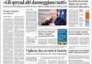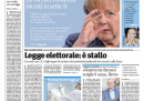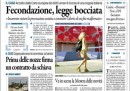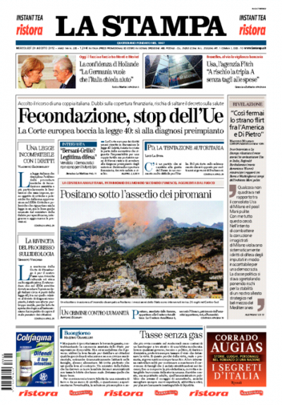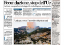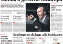 Molti giornali di oggi tornano in apertura sul decreto sulla salute presentato ieri dal ministro Balduzzi, che rischia di saltare per i dubbi di costituzionalità e sulla copertura economica. La Stampa e il Manifesto si occupano invece della bocciatura da parte della Corte europea della legge 40 sulla fecondazione assistita, il Corriere della Sera apre sui risultati dell’asta dei titoli di stato, mentre Repubblica presenta i progetti di Monti in vista dell’incontro di oggi col cancelliere tedesco Merkel.