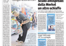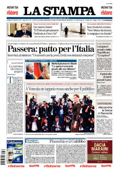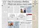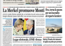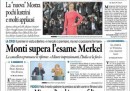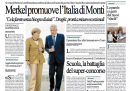 L’incontro fra il Presidente del consiglio Monti e il cancelliere tedesco Merkel, che ha apprezzato e promosso le misure del governo italiano per fare fronte alla crisi economica, è la notizia con cui apre la maggior parte dei giornali di oggi. La Stampa ha invece un’intervista con il ministro Passera che propone un “patto per l’Italia” a sindacati e imprese, l’Unità si occupa dell’intervento di Napolitano, solidale con i minatori del Sulcis, il Manifesto segue la bocciatura da parte della Corte europea della legge 40 e il ricorso annunciato dal ministro Balduzzi, mentre Libero, il Giornale e il Tempo anticipano le telefonate intercettate di Napolitano, pubblicate da Panorama. Sui quotidiani sportivi spicca la storia dell’attaccante bulgaro Berbatov, che ha illuso Fiorentina e Juventus prima di decidere di rimanere a giocare in Inghilterra.