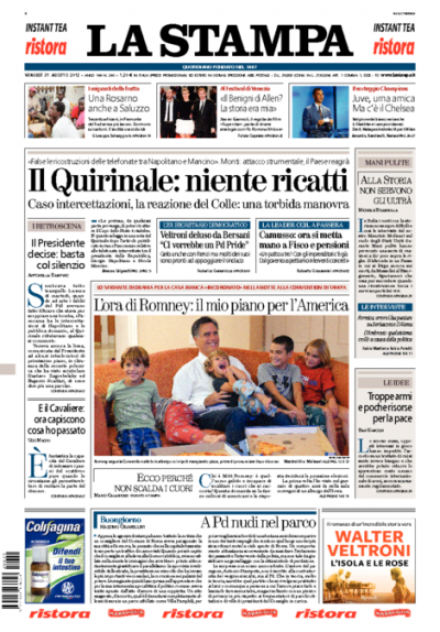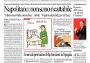 La dura reazione del Presidente della Repubblica Napolitano, che si dichiara non ricattabile e denuncia una “manovra torbida” ai suoi danni per le ricostruzioni pubblicate da Panorama delle telefonate intercettate fra lui e Mancino, è in apertura su tutti i giornali di oggi. I quotidiani sportivi si occupano del sorteggio dei gironi della Champions League per Juventus e Milan e delle trattative nell’ultimo giorno di calciomercato.