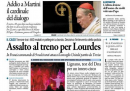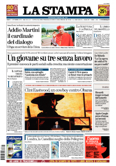La morte del cardinale Martini è in apertura sulla maggior parte dei giornali di oggi. Repubblica titola invece sulla “rivoluzione nella scuola” annunciata in un’intervista dal ministro Profumo, il Giornale e il Tempo affrontano ancora le intercettazioni delle telefonate di Napolitano e le dichiarazioni di Berlusconi, che in un’intervista al Foglio si dichiara estraneo agli attacchi al Quirinale, mentre l’Unità apre con i nuovi record di precari e disoccupazione comunicati dall’Istat. I quotidiani sportivi si occupano degli ultimi affari del calciomercato, chiuso ieri sera.