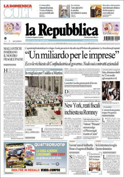 Nelle aperture dei maggiori quotidiani italiani di oggi prevale il tema economico: se Repubblica e il Sole 24 Ore dedicano il proprio titolo alle richieste che la Confindustria fa al Governo per rilanciare lo sviluppo in Italia, il Corriere della Sera si concentra sulla Spagna, che ha assicurato di essere in regola con le condizioni imposte dall’Europa. Altri hanno scelto di parlare di lavoro: La Stampa e Avvenire avvertono che sarà un (rituale) “autunno caldo” e che sono a rischio 180 mila posti, mentre L’Unità chiede una revisione della riforma sul lavoro. Su quasi tutte le prime pagine c’è anche spazio per l’omaggio di ieri dei milanesi alla camera ardente del cardinal Martini.