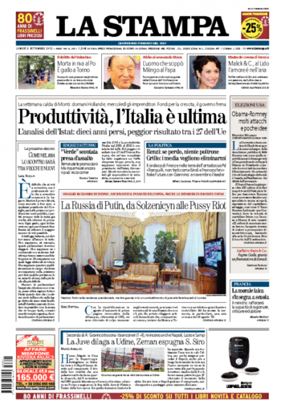I temi economici sono sempre in apertura sui giornali di oggi: il Messaggero e l’Unità si occupano dei dati Istat sulla disoccupazione giovanile, aumentata di un milione e mezzo di unità negli ultimi cinque anni, per la Stampa il dato in apertura è quello della produttività, che sempre secondo l’Istat vede l’Italia ultima fra i paesi dell’UE, e il Secolo XIX esamina gli aumenti delle tariffe a settembre. Il Corriere della Sera segue la processione dei milanesi alla camera ardente del cardinale Martini, il Giornale minimizza sulla ricerca di mandanti nel caso delle intercettazioni di Napolitano, e Repubblica presenta il piano del governo sulla giustizia. I quotidiani sportivi aprono sui risultati della domenica calcistica, con le vittorie della Juventus a Udine e della Roma a Milano con l’Inter.