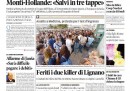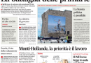 La notizia con cui apre la maggior parte dei giornali di oggi è l’incontro a Roma fra Monti e il presidente francese Hollande, concluso con un’intesa per salvare l’euro, rilanciare l’occupazione e confermare la realizzazione della TAV. Il Manifesto si occupa degli operai dell’Alcoa saliti su un silo a 70 metri per protestare contro la chiusura dello stabilimento, la Stampa segue l’inizio delle prove di ammissione all’università, l’Unità punta sul dibattito interno al PD in vista delle primarie, mentre Libero apre con una lettera del presidente di Equitalia Befera che chiede di riformare il sistema fiscale.