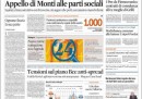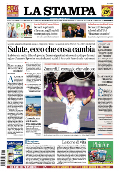 I giornali di oggi hanno in apertura notizie diverse: la Stampa, il Corriere della Sera e Avvenire si occupano dell’approvazione da parte del consiglio dei ministri del decreto salute, il Messaggero e il Secolo XIX della tensione fra il cancelliere tedesco Merkel e il presidente della BCE Draghi sull’acquisto da parte della Banca Centrale Europea di titoli di stato, il Mattino intervista il presidente del consiglio Monti, che chiede al Sud un cambio di mentalità, Repubblica presenta le novità per il commercio previste nel decreto sull’agenda digitale, l’Unità e Europa seguono la campagna elettorale per le primarie del PD, e il Giornale ipotizza un piano per eleggere Monti al Quirinale dopo Napolitano.