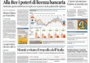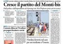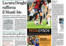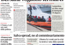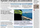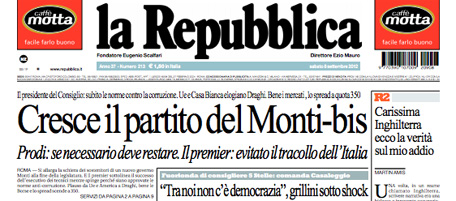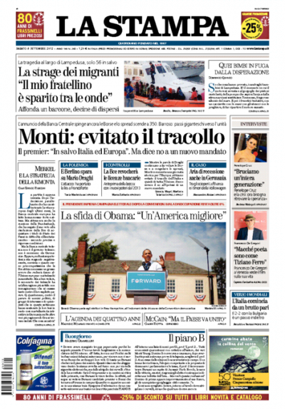 Sono due le notizie principali in apertura sui giornali di oggi: l’ipotesi di un nuovo governo Monti dopo le elezioni, lanciata da Romano Prodi a Cernobbio, è in apertura su Repubblica, il Messaggero, il Mattino e il Secolo XIX, mentre la Stampa, Avvenire e il Manifesto si occupano del naufragio di un barcone di immigrati al largo di Lampedusa. Il Giornale chiede al governo di approfittare del calo dello spread per abolire l’IMU, mentre i quotidiani sportivi commentano il pareggio dell’Italia in Bulgaria nella prima partita per le qualificazioni ai mondiali in Brasile.