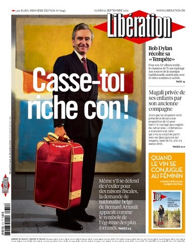 La prima pagina del quotidiano francese Libération di oggi è dedicata a Bernard Arnault, l’uomo più ricco di Francia e il quarto più ricco al mondo, che ha fatto domanda per ottenere la cittadinanza belga. Arnault ha spiegato la richiesta dicendo di avere legami affettivi e familiari nel paese ma secondo molti giornali si tratterebbe solo di un tentativo di evitare l’aumento di una tassa – dal 48 al 75 per cento – sui cittadini con un grande patrimonio annunciata dal presidente francese Francois Hollande. Libération ha pubblicato in prima pagina una foto di Arnault con una valigia in mano accompagnata dalla titolo «Levati di torno, ricco coglione!».