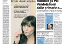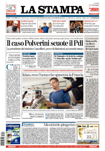 La maggior parte dei giornali di oggi si occupa in apertura del governatore del Lazio Polverini, che avrebbe manifestato ieri l’intenzione di dimettersi dopo lo scandalo sulle spese sostenute con i fondi del gruppo PDL, e del rischio di scissione nel partito da parte di un gruppo di ex AN. Il Corriere della Sera e Avvenire aprono invece sulla decisione della Francia di chiudere 20 ambasciate nei paesi islamici per paura di ritorsioni dopo la pubblicazione di vignette satiriche su Maometto da parte di un giornale francese, mentre i quotidiani sportivi esaltano il pareggio della Juventus a Londra con il Chelsea in Champions League.