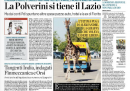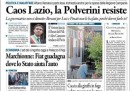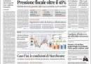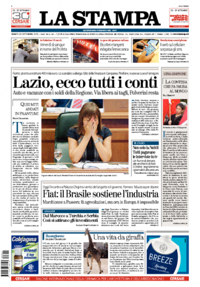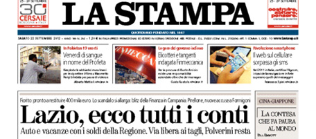 Le indagini sulle spese dei gruppi consiliari regionali sono in apertura su quasi tutti i giornali di oggi: mentre in Lazio rientra la minaccia di dimissioni di Polverini dopo l’approvazione dei tagli di spesa da parte del Consiglio Regionale, la Finanza indaga sulla Regione Campania. L’Unità e il Manifesto si occupano invece delle dichiarazioni di Marchionne, che “batte cassa” al governo giustificando gli investimenti della FIAT in Brasile con la possibilità di utilizzare gli incentivi per l’auto previsti in quel paese e non in Italia, mentre il Sole 24 Ore titola sui dati della pressione fiscale in Italia, arrivata oltre il 45%, e il Giornale prosegue la sua campagna sul rischio di arresto per Sallusti e sulla libertà di stampa.