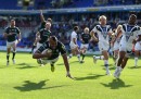 READING, ENGLAND – SEPTEMBER 22: Jonathan Joseph of London Irish dives to score a try during the Aviva Premiership match between London Irish and Bath Rugby at Madejski Stadium on September 22, 2012 in Reading, England. (Photo by Warren Little/Getty Images)