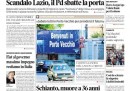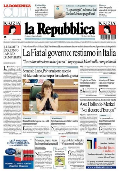 Le aperture dei più importanti quotidiani di oggi sono dedicate all’incontro di ieri a Palazzo Chigi tra i vertici della Fiat e il Governo, che si è concluso con le rassicurazioni da parte di Marchionne e Elkann sulla volontà dell’azienda di non lasciare l’Italia. C’è poi spazio per gli sviluppi dello scandalo che ha colpito la Regione Lazio, con la notizia delle possibili dimissioni da parte dei consiglieri del Partito Democratico. Fa eccezione Il Giornale, che dedica quasi interamente la sua prima pagina all’articolo di Alessandro Sallusti che parla della verità sull’arresto di Alessandro Sallusti.