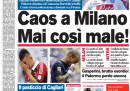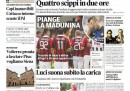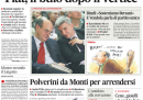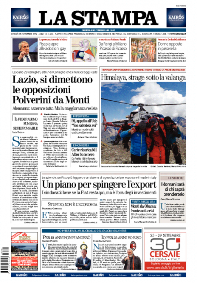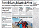 Lo scandalo delle spese fuori controllo del gruppo PDL alla Regione Lazio è in apertura sulla maggior parte dei giornali anche oggi, con l’incontro fra il Presidente del Consiglio Monti e il governatore Polverini e il ritorno d’attualità dell’ipotesi di dimissioni di quest’ultima, e le dimissioni in blocco dei consiglieri regionali di PD, SEL e IDV. L’Unità, il Secolo XIX e Pubblico si occupano invece delle reazioni negative di partiti e sindacati all’incontro fra il governo e Marchionne sul futuro della FIAT in Italia. I quotidiani sportivi puntano i riflettori sulla crisi di Milan e Inter, entrambe sconfitte nella giornata di campionato di ieri.