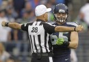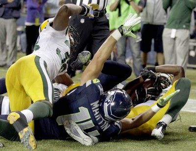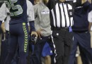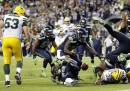 Ieri sera c’è stato l’ultimo episodio. I Seattle Seahawks hanno battuto i Green Bay Packers 14 a 12. I Seahawks, che giocavano in casa, stavano perdendo 12 a 7. Dopo una meta molto contestata, però, il risultato è stato ribaltato. Nel football americano, la meta (touchdown) vale 6 punti e si può assegnare in due modi: o ricevendo un passaggio al volo all’interno dell’area di meta (end zone) o varcando la stessa correndo con il pallone in mano. A otto secondi dalla fine della partita, quando risultato era di 12 a 7 per i Green Bay, Russell Wilson dei Seahawks ha lanciato la palla al suo compagno di squadra Golden Tate, che si trovava vicino all’area di meta, da una distanza di 20 metri circa. Tate, in attesa del passaggio, era “in lotta” con Sam Shields dei Green Bay per cercare di afferrare la palla. In un groviglio di giocatori MD Jennings dei Green Bay è riuscito a saltare più in alto di tutti e prendere la palla con tutte e due le mani. Tate gli si è aggrappato addosso e un mucchio di giocatori è finito a terra, con la palla sommersa sotto di loro. Per Tate è meta, per MD Jennings la palla è stata riconquistata dalla difesa.
