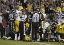 Da lì sono iniziate le proteste dei Green Bay. Quello che li ha fatti arrabbiare è stato il fatto che la palla era stata afferrata prima, con entrambe le mani, da un loro giocatore che poi ha subito anche un fallo. Ci sono voluti dieci minuti per riportare i giocatori in campo per giocare l’extra point, la trasformazione, come da regole del football americano quando si conquista una meta.