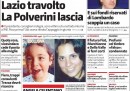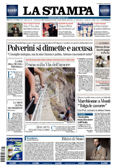 La notizia di apertura su tutti i giornali di oggi sono le dimissioni di Polverini, dopo la sfiducia dell’UDC e le parole del cardinale Bagnasco sul malaffare della politica, con l’accusa dell’ormai ex presidente della Regione Lazio ai componenti del Consiglio regionale di essere “indegni” per la carica a cui sono stati eletti. Altre notizie che si trovano su molte prime pagine sono la lite fra Marchionne e Della Valle sulla FIAT e la frana alle Cinque Terre, con quattro turisti feriti. I quotidiani sportivi anticipano la partita di stasera fra Juventus e Fiorentina per il campionato di calcio di serie A.