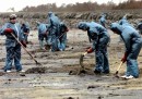 ** FILE ** French workers attempt to clean oil from the beach at Le Croisic, western France, in this Jan. 7, 2000 file picture, three weeks after the tanker “Erika” broke in two off Britanny, France. The “Erika,” a tanker leased by Total, was carrying fuel oil owned by a division of the company when it split in two and sank in rough seas on Dec. 12, 1999 off western France, spewing nearly 22,000 tons of oil into the Atlantic. All 26 crew members were saved. The Erika trial wrapped up Wednesday June 13 2007 with speeches by the defense. and lasted over four months. The verdict is not expected before January 2008. (AP Photo/Franck Prevel, File)