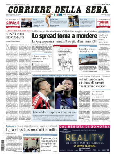 I giornali di oggi hanno in apertura notizie diverse: Repubblica, il Corriere della Sera e il Messaggero tornano a occuparsi della crisi economica con la giornata nera per le borse europee e lo spread che sale nuovamente, il Giornale, Libero e il Tempo titolano sulla conferma da parte della Cassazione della condanna a 14 mesi per Sallusti, l’Unità, il Fatto e il Manifesto seguono la vicenda Polverini, che dopo averle annunciate non ha ancora formalizzato le dimissioni, e il Secolo XIX e Avvenire aprono con la sollecitazione del Presidente della Repubblica Napolitano al Parlamento per approvare in tempi brevi il decreto anti corruzione. I quotidiani sportivi commentano la giornata di campionato che porta il Napoli in testa alla classifica insieme alla Juventus dopo la vittoria sulla Lazio con una tripletta di Cavani.