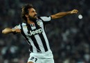 Juventus’ Andrea Pirlo celebrates after he scored during a Serie A soccer match between Juventus and A.S. Roma at the Juventus Stadium in Turin, Italy, Saturday, Sept. 29, 2012. (AP Photo/Massimo Pinca)