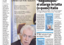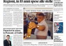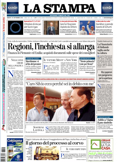 Le inchieste sulle spese effettuate con i fondi regionali si allargano oggi al Piemonte, dove si sospettano vacanze rimborsate ai consiglieri, e all’Emilia Romagna, guadagnando l’apertura su quasi tutti i giornali. Fanno eccezione Libero, che in tempi di querele sulla libertà di stampa accusa il Presidente della Camera Fini di voler “far chiudere” il giornale con la sua richiesta di risarcimento, Europa, che titola sulle primarie del PD e sull’opposizione di Bersani e Renzi alla ricandidatura di Monti al governo, il Tempo, che invece sostiene Monti e cerca di formare un “partito” a sostegno della sua candidatura, e Pubblico, che commenta la partecipazione di Renzi a Piazza pulita di giovedì. Sui quotidiani sportivi tiene banco la partita di stasera fra Juventus e Roma, con le annose polemiche relative alle dichiarazioni di Zeman sulla Juve.